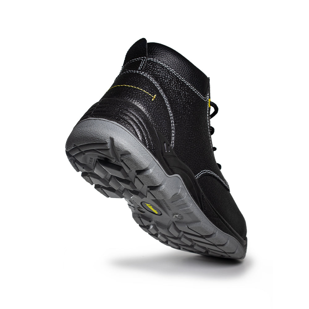 Calzado de seguridad con capellada de cuero, diseñado para proporcionar protección integral en entornos laborales. Cuenta con una resistente plantilla de acero antiperforante de 1100N. y una suela antideslizante de que garantiza una tracción segura. Además, es resistente a los hidrocarburos y sus derivados, cumpliendo con los más altos estándares de seguridad. Este calzado también presenta características adicionales que lo hacen destacar, como su propiedades dieléctricas que proporciona aislamiento eléctricos, una puntera de acero ultraliviano para mayor protección. Posee un contrafuerte que asegura un soporte adecuado. Los pasacordones añaden un toque de durabilidad y funcionalidad, completando así un calzado que combina estilo, comfort y seguridad en cada paso.