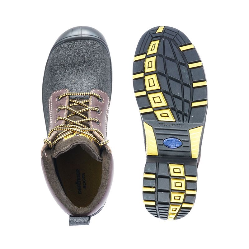 Botín Defender Antiácido Fighter DF908, Aislante eléctrico para tensiones inferiores a 600 volt, Certificación norma chilena oficial, Color café nogal, Cordones sección circular de alta resistencia, Costuras dobles con hilo Nylon T-20 imputrescible,Cuello acolchado ,Cuero - capellada color negro, Cuero náutico,Entreplantilla antipunzonante,Fabricación con inyección directa al corte ,Forro interior de cuero, Ojetillos no metálicos - plásticos de alta resistencia, Planta de caucho con Acrilo Nitrilo con Shock Absorber, resistente a derivados de los hidrocarburos, Plantilla interior intercambiable - Ergo-Soft PI 104, Puntera LCT (Light Composite Toe Cap) no metálica